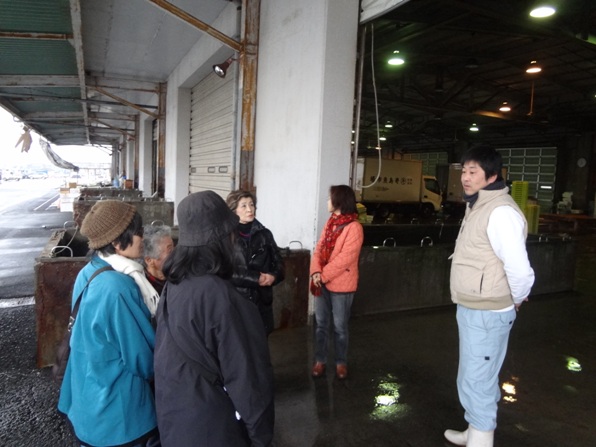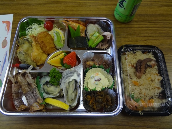 次に向かったのは、寄島漁業協同組合の市場です。こちらも三宅秀次郎組合長自らご案内をいただきました。その後組合事務所へ移動して、女性部の方々に作っていただいた、“海の幸満載のお弁当”とのご対面です。弁当は本当に豪華で、イイダコ(飯蛸)には、その名のとおり「イイ(卵)」が一杯つまっているし、コロッケにも、ポテトサラダにもタコが入っているなど、ほとんどのメニューに海の幸が使われていました。とても美味しくいただきました。また、漁業に精通している組合長さんからは瀬戸内で獲れる魚や、この後体験するよりしまカキの特徴などお話いただき、約1時間和やかに談笑しました。