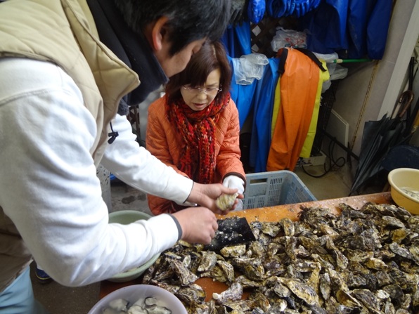 食事後、カキ工場に移動して、今度はカキ打ち(カキの殻むき)体験です。組合長さんからカキ打ちのやり方を教わりながら行いました。シャコの皮むき同様こちらのカキ打ちも職人さんのようにはやっぱり上手くいきませんでしたが、普段できない貴重な体験ができました。また、カキ打ち後は、身がぷりぷりとした焼きカキを美味しくいただきました。ありがとうございました。