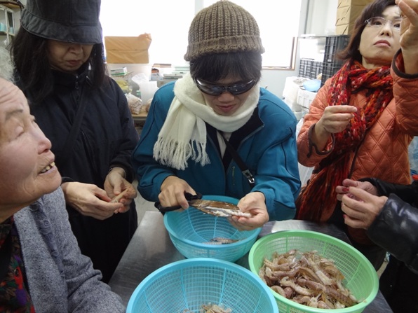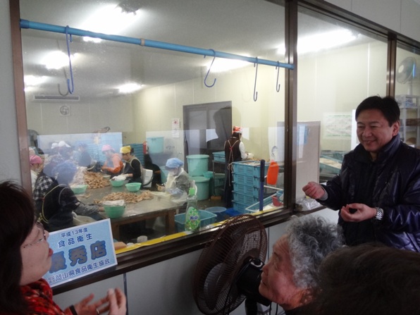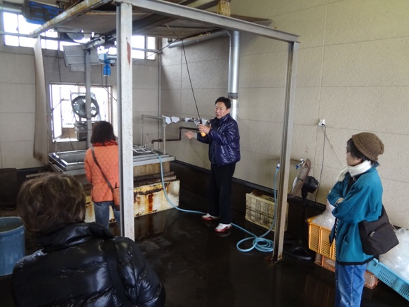 次に社員の方が山のようにあるシャコの皮をむいている作業場を見学させていただき、社長さんが、シャコにこだわって事業を続けてきた熱い思いを聞かせていただきました。