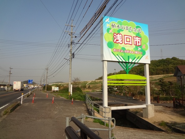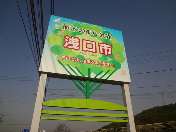 先月末、浅口市金光町大谷地区の国道2号線沿いに、「植木のまち金光」をPRする大型看板が設置されました。