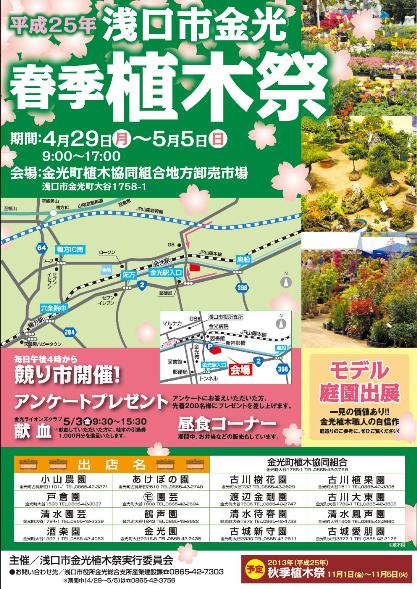 また、4月29日(月)から5月5日(日)まで、毎年恒例の「浅口市金光春季植木祭」が開催されます。会場は、金光町植木協同組合地方卸売市場です。無料駐車場も用意されています。