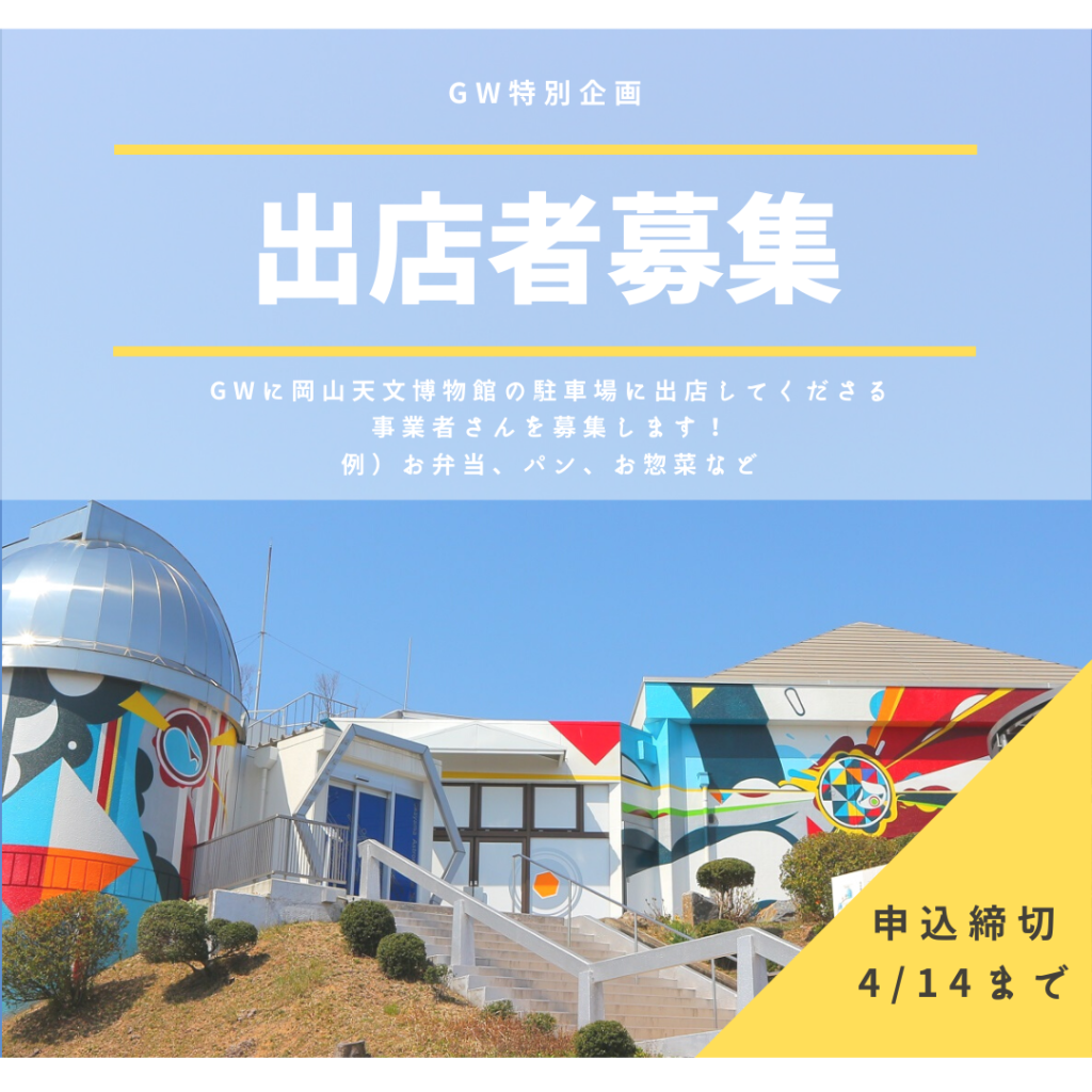 市内にある岡山天文博物館は、全国区最大級の望遠鏡を備える天文台を隣接し、例年GWは、多くのお客様で賑わいます!その中で、お客様から博物館周辺の昼食を食べられる施設を尋ねられるのですが、残念ながら近くに飲食店がありません。