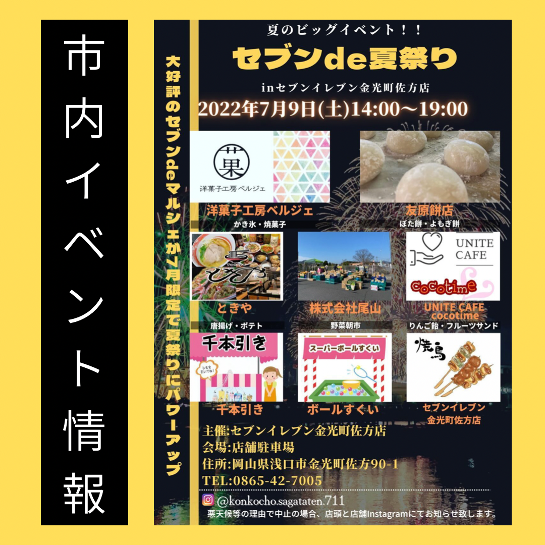 【会員さんのイベント情報】 7月9日(土)セブンイレブン金光町佐方店でセブンde夏祭りが開催されるようです😊 当協会会員のベルシェさんと友原餅店さんも参加されます✨ このマルシェは、地域を盛り上げたいという思いで、セブンイレブン金光町佐方店さんが月一回を目標に開催されているマルシェです☀️今回は、夏限定で夏祭りにパワーアップ!! ぜひ遊びにお越し下さい😊