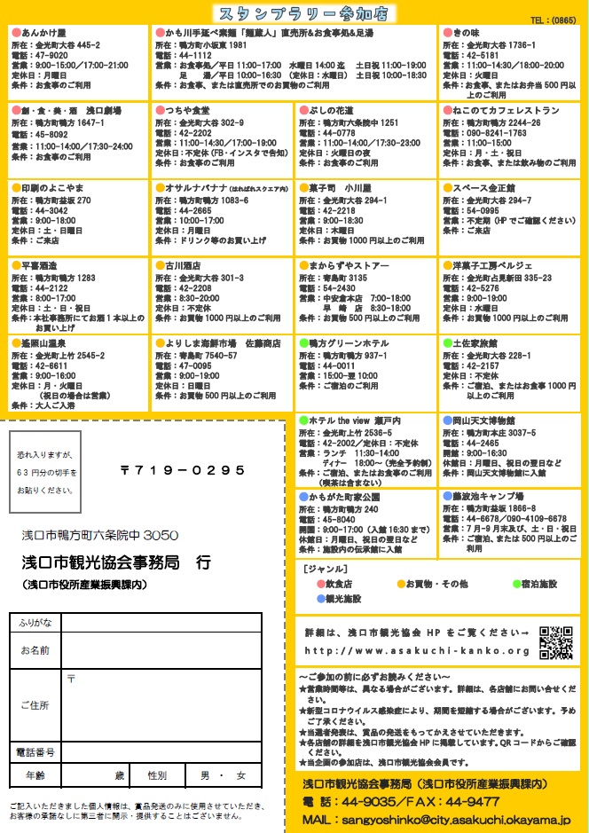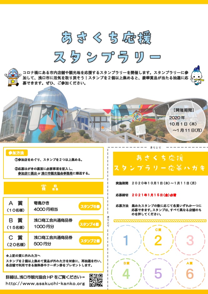 コロナ禍にある市内店舗や観光地を応援するスタンプラリーを開催します。スタンプラリーに参加して、浅口市に活気を取り戻そう!スタンプを2個以上集めると、豪華賞品が当たる抽選に応募できます。ぜひ、ご参加ください。