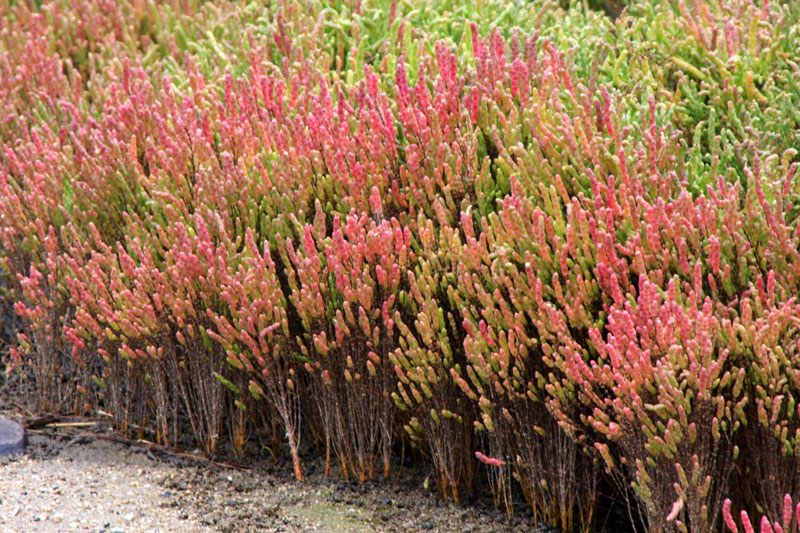 ・秋には全体が緑から赤へと色づき、その見た目からサンゴソウ、ヤチサンゴ(谷地=湿地のこと)、クラブグラス(crab-grass蟹の草)とも呼ばれます。