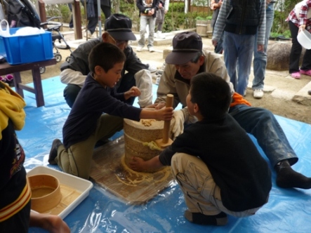 3日の日替わり体験は、「きな粉作り」・「火おこしと土釜炊飯」でした。