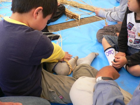 小さい子供に何をしているのか聞かれたのですが、きっと「なわ」自体を知らないのだろうなあと思い、「藁(わら)でひもを作っている」と言うと、興味を持ったようでした。