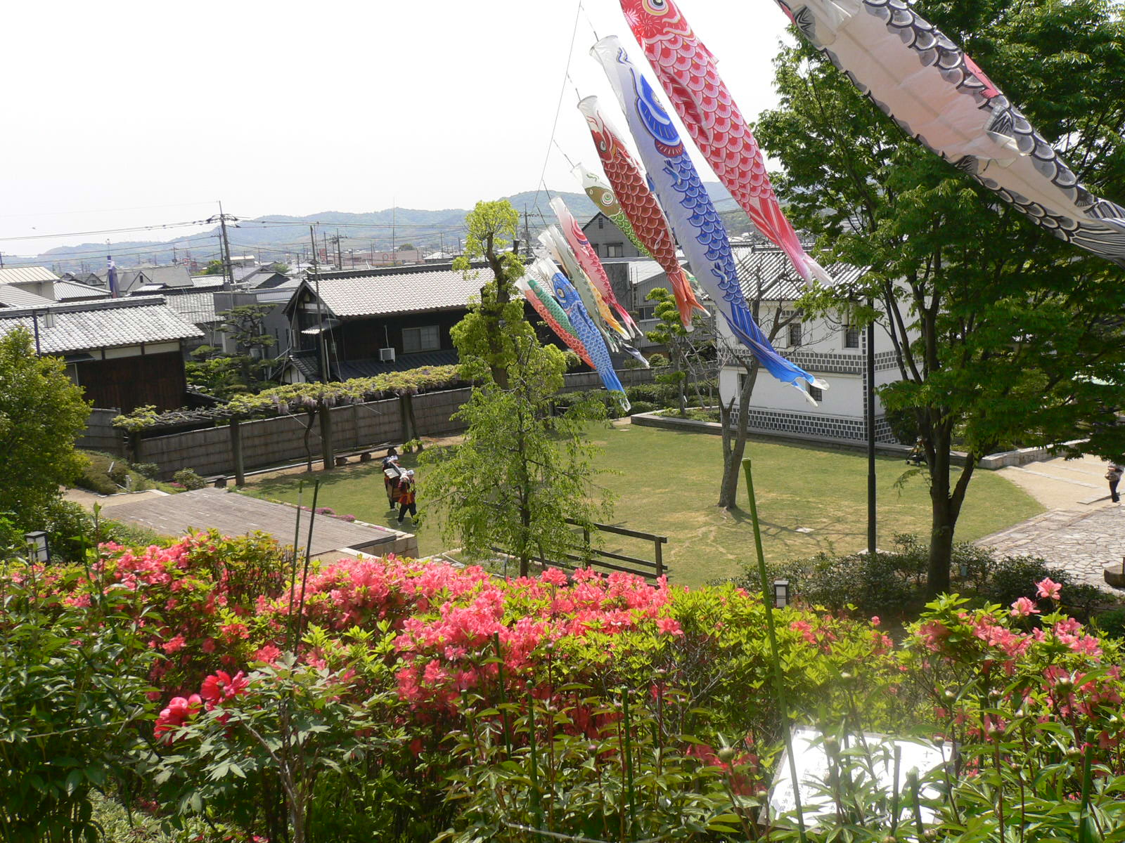 町家公園には牡丹やカキツバタの花が咲いており、また、新緑の中を泳ぐこいのぼりが、初夏の景色を演出しています。