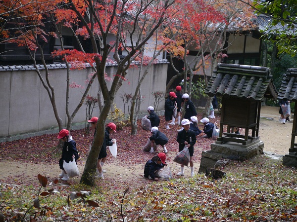境内では地元小学生の課外授業中。みんなで落ち葉を集めていました。