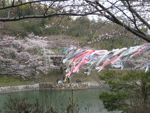 池の上には、今年は早くも鯉のぼりが気持ちよさそうに泳いでいました。昨年は桜のシーズンには鯉のぼりはなかったので、今年は桜と鯉のぼりの両方を一度に写真を撮るチャンスです。
