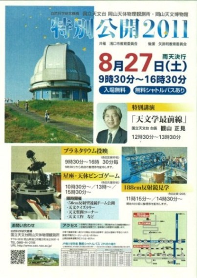 8月27日(土)国立天文台岡山天体物理観測所の特別公開があります。