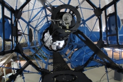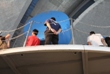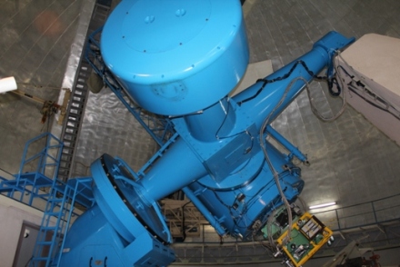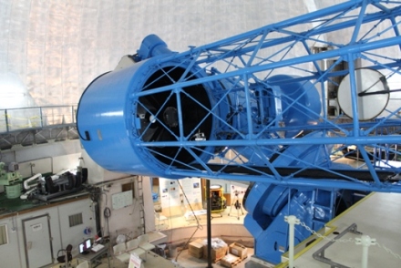望遠鏡が動くのでなく、ドームにある手すりのついた通路に移り、ドームの天井(丸い部分)が通路ごとぐるりと動き、私たちがそのまま動いて、反射望遠鏡の反射鏡を覗き込むことができるようになっています。あまりに大きなものが動くので、自分が動いているのがわからなくなるような不思議な体験をしました。