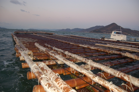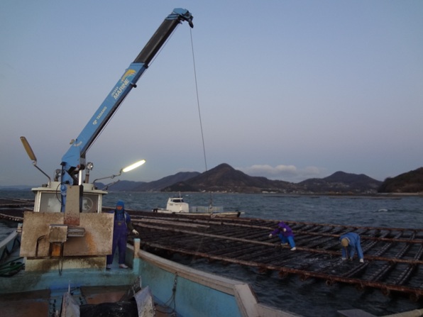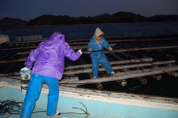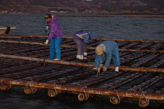 牡蠣いかだに到着し、いよいよ作業開始です。漁港ではあまり波はなかったのですが、沖にくると風が出て波が高くなり、船が揺れ素人が立っているのは、かなり怖いです。漁業に携わっている人はさすがに慣れていて黙々と作業を行っています。また、牡蠣いかだを間近で見る機会はなかなかないのですが、いかだの材料である竹は非常に太く、それを組み立てて作っているいかだはとても大きく迫力がありました。