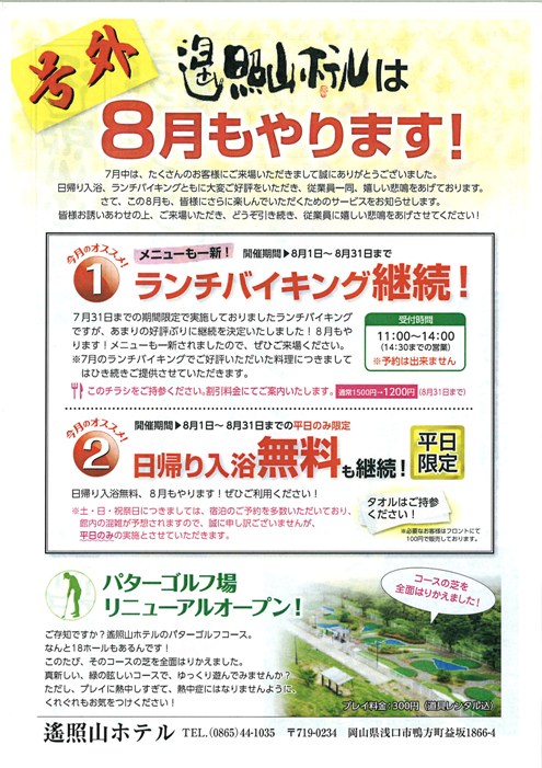 浅口市の遙照山ホテルがリニューアルに合わせて始めたランチバイキングが、好評につき期間延長されました。8月31日まで毎日あります。