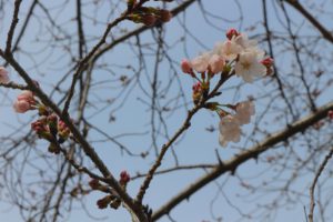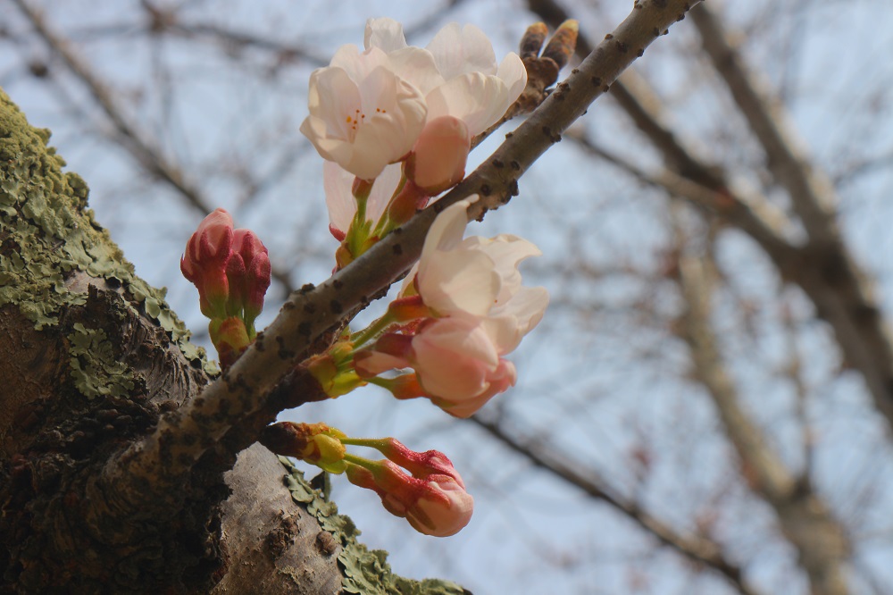 3月26日(木)の午前中、天草公園に桜の様子を見に行くと、小さな桜の花が咲き始めていました。