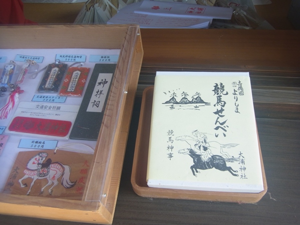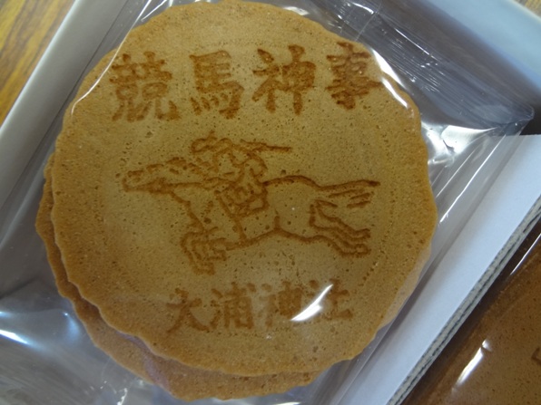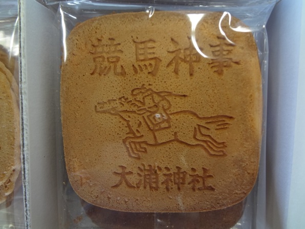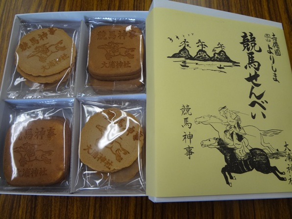 宮司さんによると、この『競馬せんべい』は、本来は直会(なおらい)として差し上げるものだそうですが、お参りされた方や近所の方の要望によりお土産としても取り扱っているそうです。近所の人には『勝ちせんべい』として知られています。