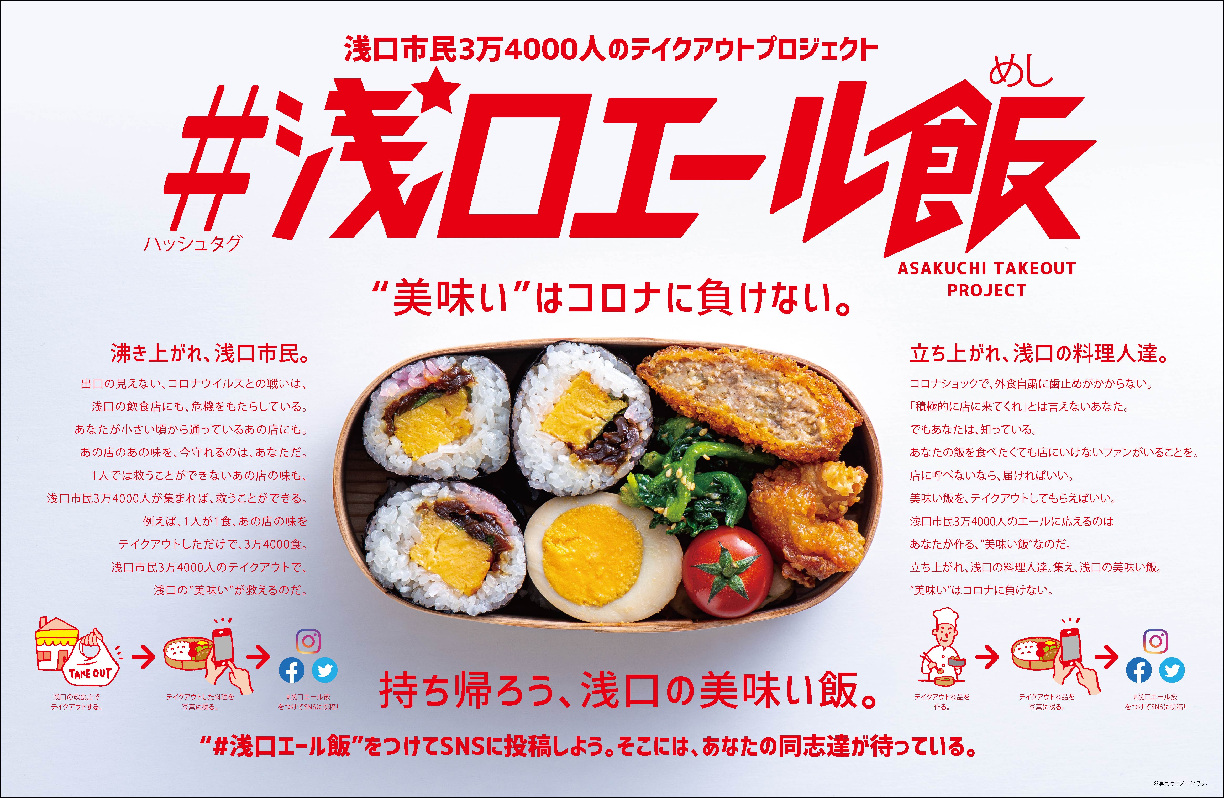 新型コロナウイルスにより外出自粛状態となっている今、大きな打撃を受けている浅口市の飲食店が、感染症リスクを抑えながら売上を確保しやすくなるように、テイクアウト(持ち帰り)・デリバリー(配達)を行うお店情報を集約し、市民の方に広報いたします。