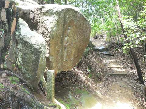 ここから遊歩道で山に入ると小さい石仏があり、もう少し登ると・・・・