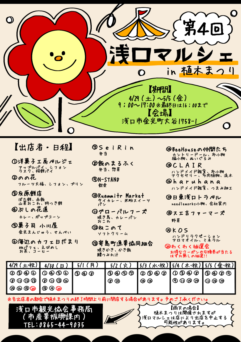 イベントの詳細や浅口マルシェの出店スケジュール等は、以下のチラシをご覧ください。