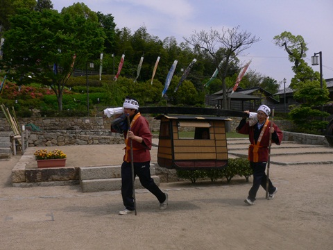 おかご乗りは、小さい子供限定ですが、昔の乗り物のお籠。人が担いで