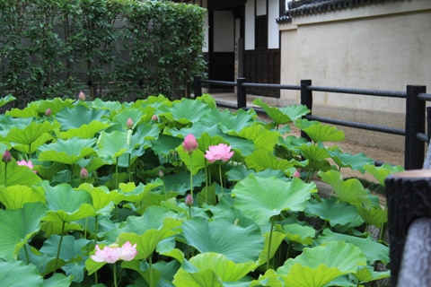 ハス池の向こうに見えるのが阿藤伯海旧居です。