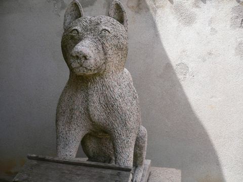 拝殿横にお賽銭箱の前に何やら座っている でそこにお賽銭を入れて「今日もいいことがありますように」とお願いする。
