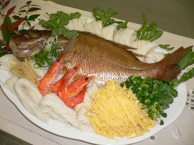 鯛を煮付けてお皿に盛り そうめんを波にみたてて周りに並べて