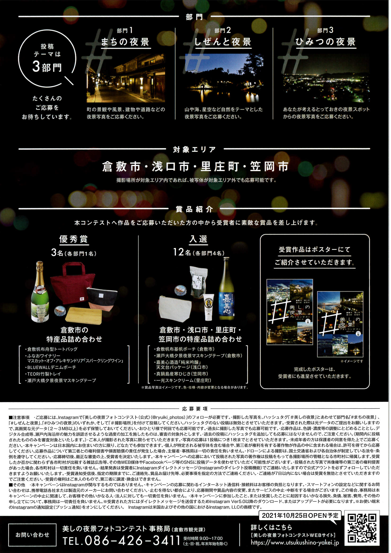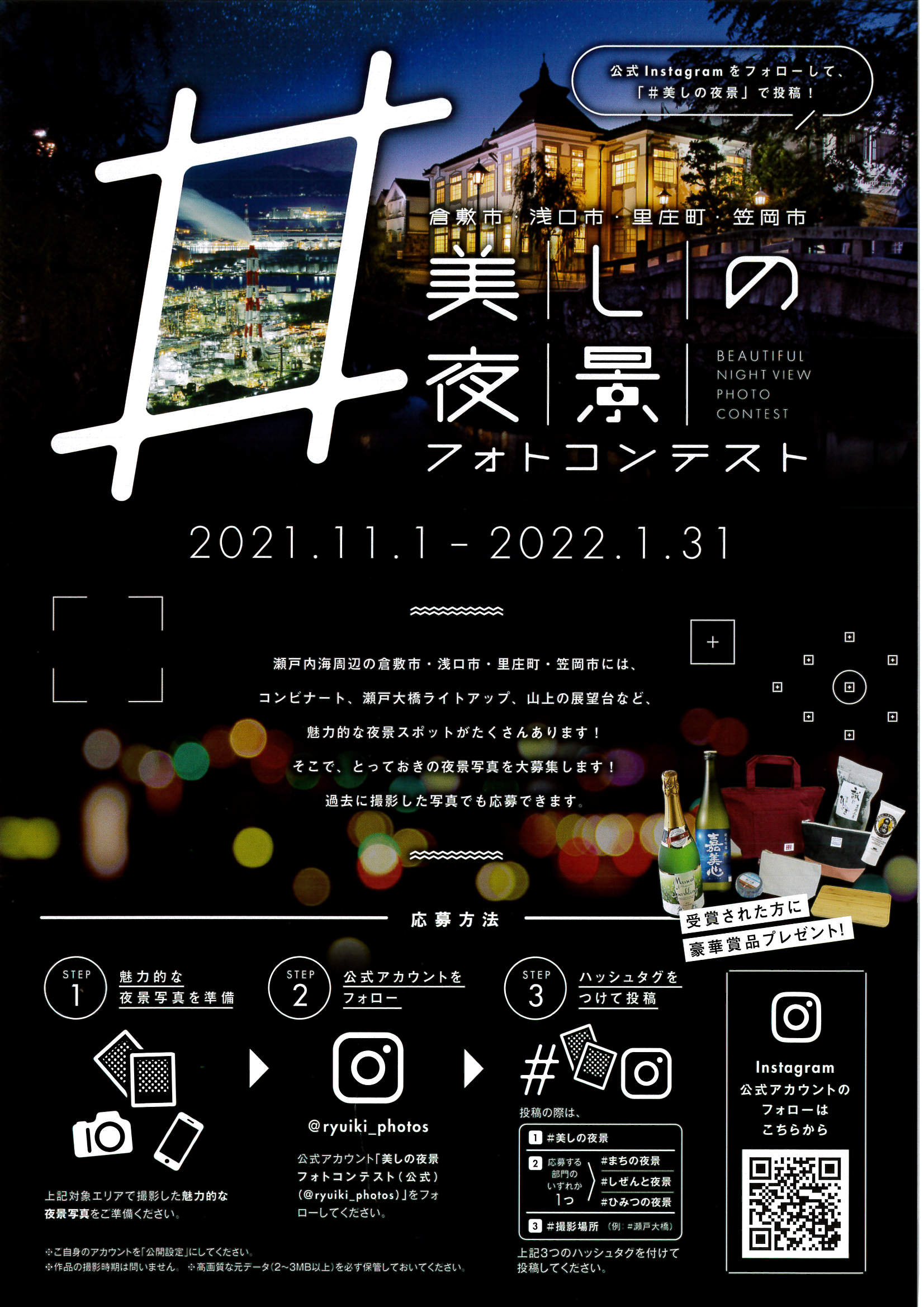 瀬戸内海周辺の倉敷市・浅口市・里庄町・笠岡市には、コンビナート、瀬戸大橋のライトアップ、山頂の展望台など魅力的な夜景スポットがたくさんあります✨上記の対象エリアで撮影した夜景写真を応募すると抽選で豪華賞品が当たります📷✨#美しの夜景フォトコンテストは、2021年11月1日(月)から2022年1月31日(月)までの開催です。応募方法などの詳細はこちらからご覧ください→〈#美しの夜景フォトコンテスト公式サイト〉