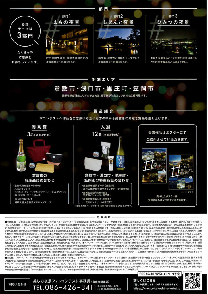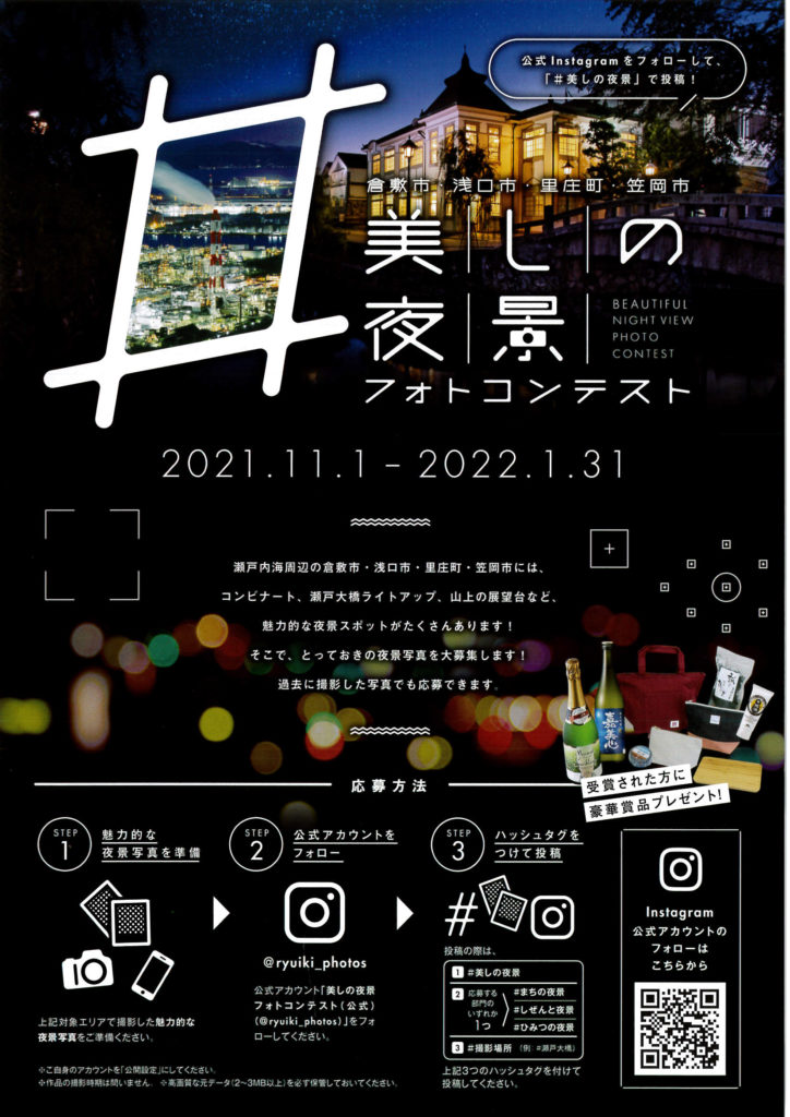 瀬戸内海周辺の倉敷市・浅口市・里庄町・笠岡市には、コンビナート、瀬戸大橋のライトアップ、山頂の展望台など魅力的な夜景スポットがたくさんあります✨上記の対象エリアで撮影した夜景写真を応募すると抽選で豪華賞品が当たります📷✨#美しの夜景フォトコンテストは、2021年11月1日(月)から2022年1月31日(月)までの開催です。応募方法などの詳細はこちらからご覧ください→〈#美しの夜景フォトコンテスト公式サイト