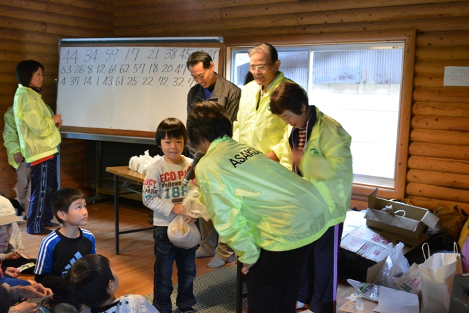 昼食後は、少し雨が降ってきたこともあり、キャンプ場の施設である研修棟で、トレッキング大会の表彰が行われました。歩く時間やクイズの正解率等すべてよかった班や、大声大会での上位者に景品が贈られていました。