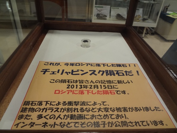 恐竜等の化石だけではなく、なんと今年ロシアのチェリャビンクス州に落下した「隕石」(現物)まで展示されています。恐竜の絶滅には隕石衝突説もありますし、天文つながりで貴重な展示です。