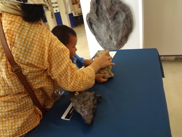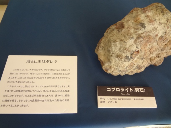 また、反対側では、一億年位前の恐竜のフンが化石として残った「コプロライト(糞石)」等の展示がありました。この化石には実際に触ることができるようになっていました。