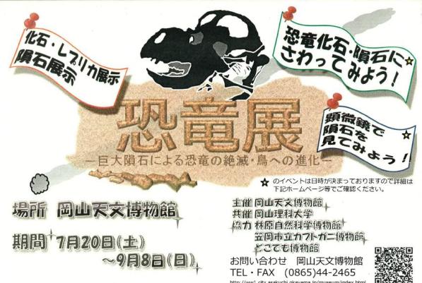 7月20日から岡山天文博物館で、隕石や恐竜の化石等を展示した「恐竜展 −巨大隕石による恐竜の絶滅・鳥への進化−」が開催されています。