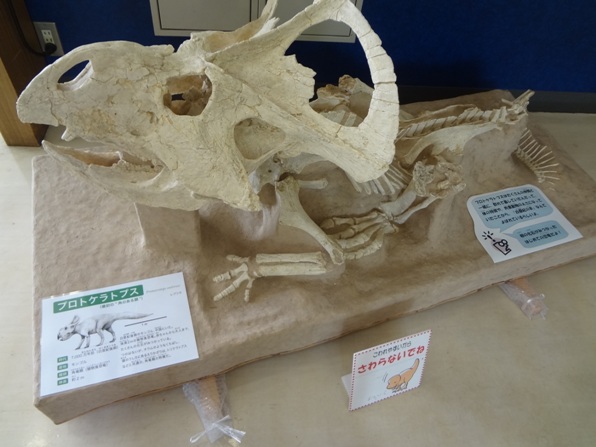 入口を入るとすぐに、恐竜の中でもよく知られている角竜類「トリケラトプス」の同じ種類にあたる「プロトケラトプス」の骨格(複製)が展示されています。頭のうしろにあるえりかざりが特徴的です。