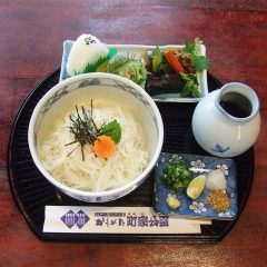 かもがた町家公園内にある「和風喫茶 まちや亭」では、地域の特産である手延素麺が年間を通して食べられます。おすすめは、おにぎりや惣菜付きの“そうめんセット”。価格はなんとワンコイン!手延べ麺は通常の麺に比べ、つるっモチッとした食感が絶品。